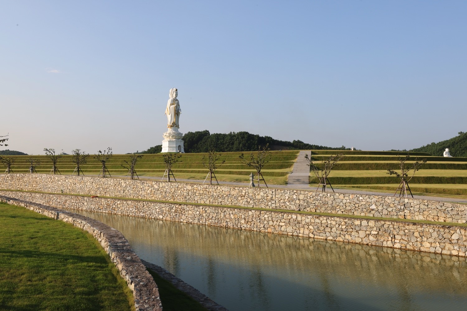Hình ảnh Quán Thế Âm Bồ Tát phía xa xa khi Khách hàng dạo bước quanh Công viên Thiên Đường