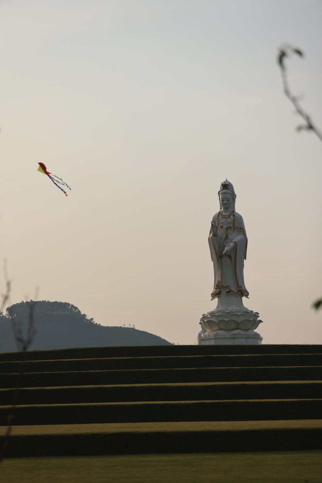 Cánh diều êm ả, nhẹ nhàng bay trên bầu trời cạnh Tượng Quán Thế Âm Bồ Tát khi hoàng hôn buông xuống